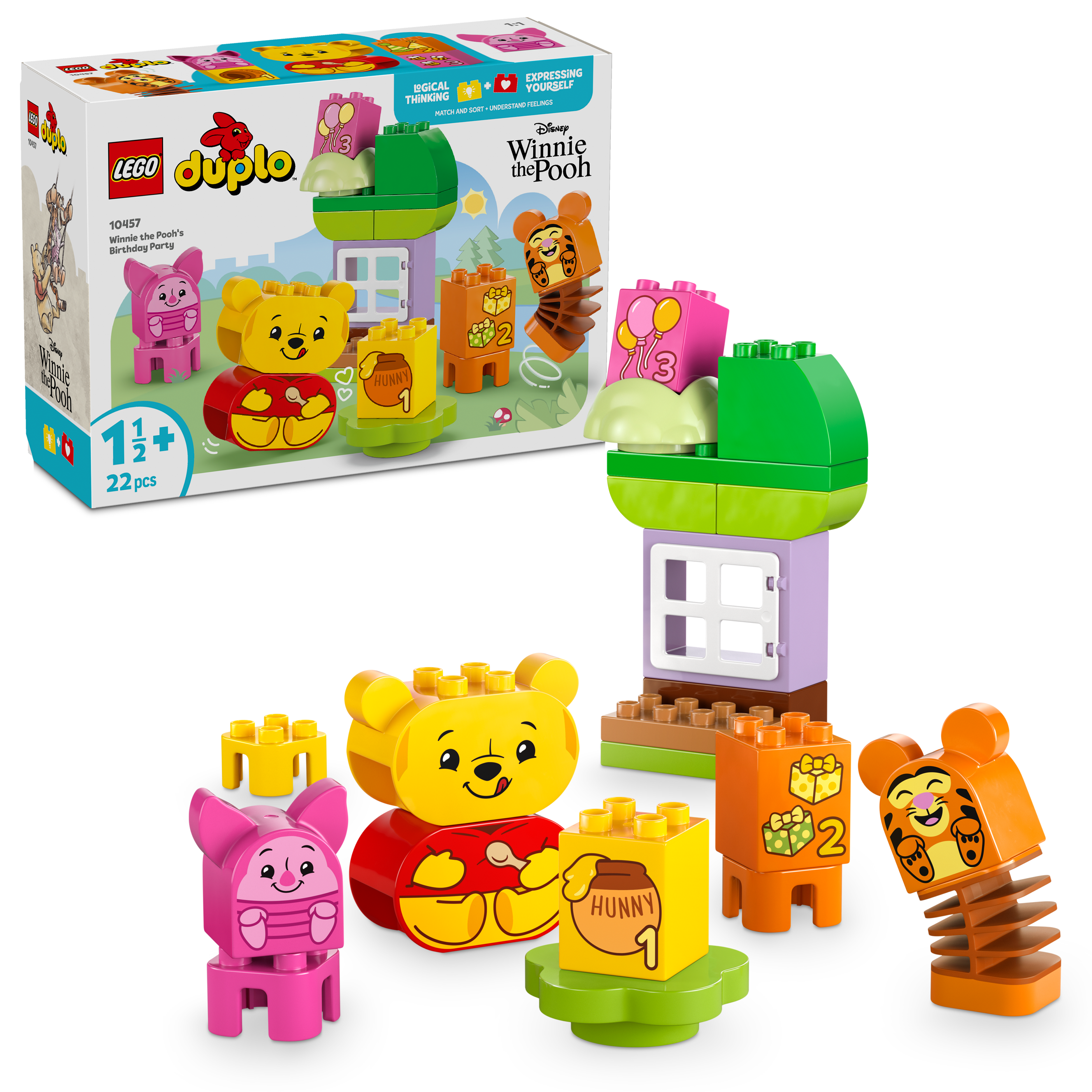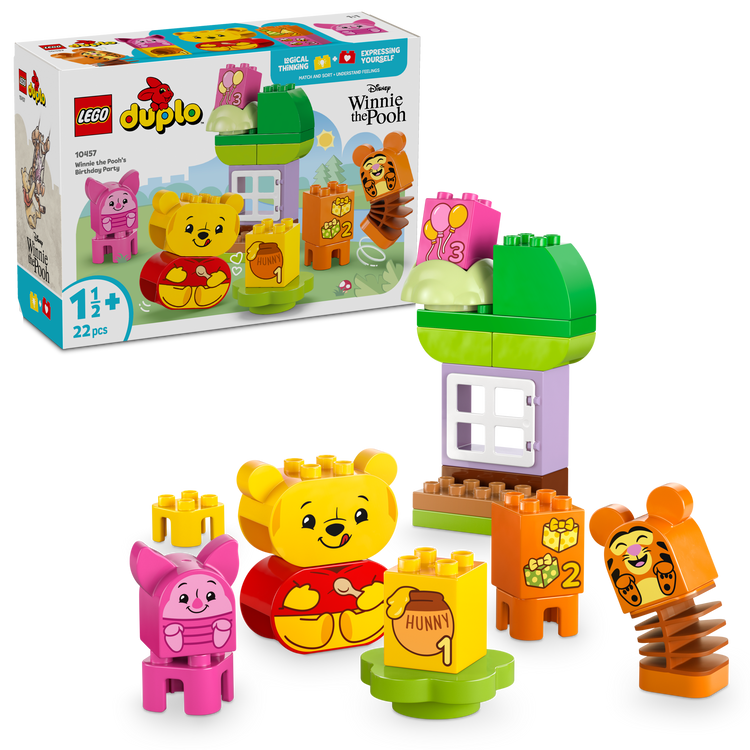 Mit dem LEGO DUPLO | Disney Winnie Puuhs Geburtstagsparty (10457) tauchen Kleinkinder ab 18 Monaten in eine liebevoll gestaltete Spielwelt voller Fantasie, Tiere und Emotionen ein. Dieses Montessori-inspirierte Lernspielzeug fördert auf spielerische Weise Feinmotorik, Farberkennung und erstes Zählen – toll für gemeinsames Spielen von Eltern und Kind. Das Set enthält drei bekannte LEGO DUPLO Minifiguren: Winnie Puuh, Tigger und Ferkel. Jede Figur hat einen drehbaren Kopf mit zwei Gesichtsausdrücken, sodass Kinder erleben können, wie unterschiedlich man sich auf einer Party fühlen kann – vom fröhlichen Lachen bis zum kleinen Missgeschick mit den Süßigkeiten.