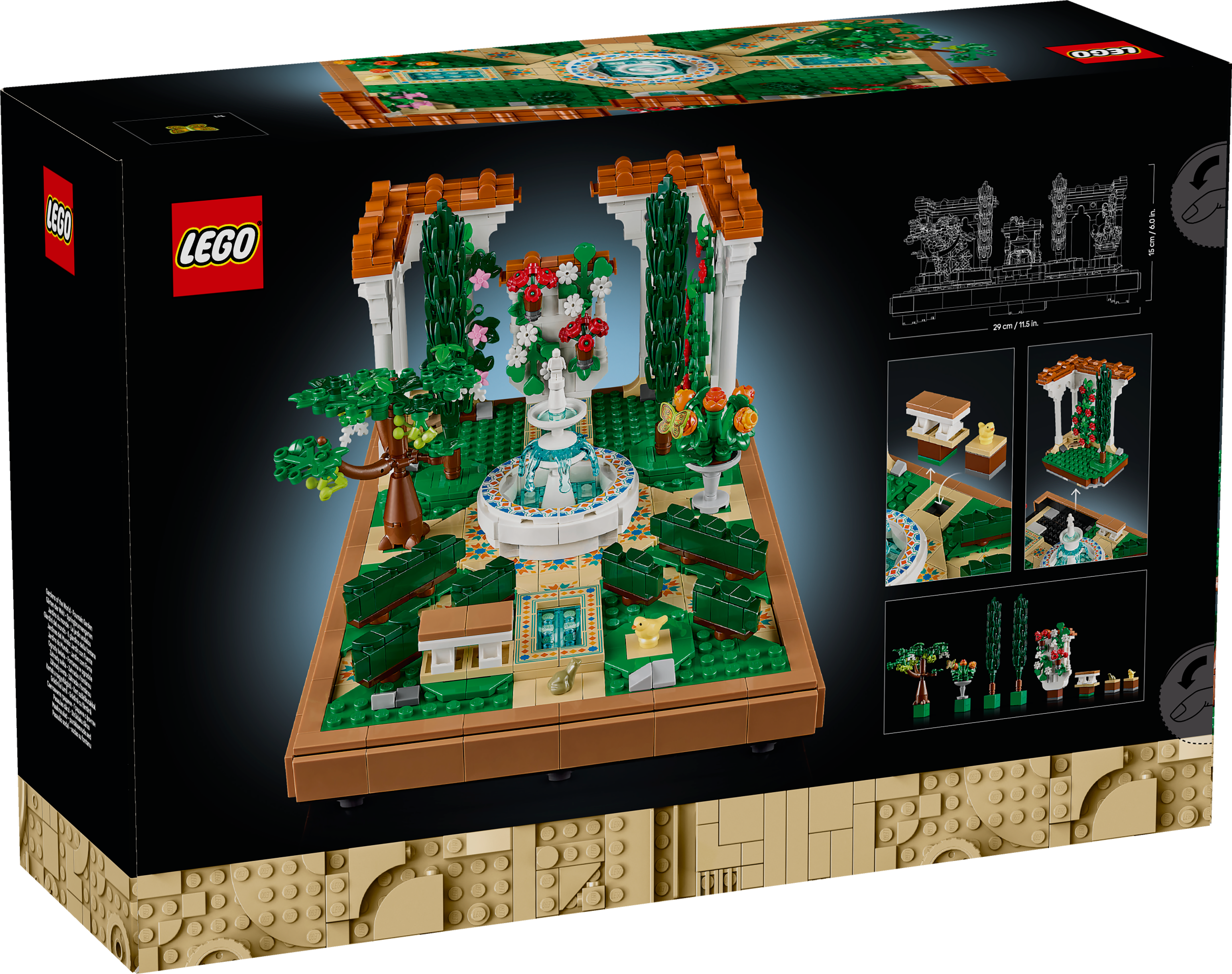 Diesem neuesten Set aus der Kollektion Gärten der Welt diente die Gartenarchitektur mit all ihrer Schönheit und Vielfalt als Vorbild. Das Modell beinhaltet einen Schalenbrunnen, ein dekoratives Waschbecken, gepflasterte Wege, Bäume, Tieren und blühende Ranken, die weiße Laubengänge mit roten Dächern schmücken. Im Garten befinden sich außerdem eine blühende Weinrebe, 2 Zypressen, eine rote Geranie, weiße Petunien, ein roter Hibiskus, rosafarbene Bougainvillea und Ringelblumen sowie ein Vogel, ein Frosch und eine Lunamotte.