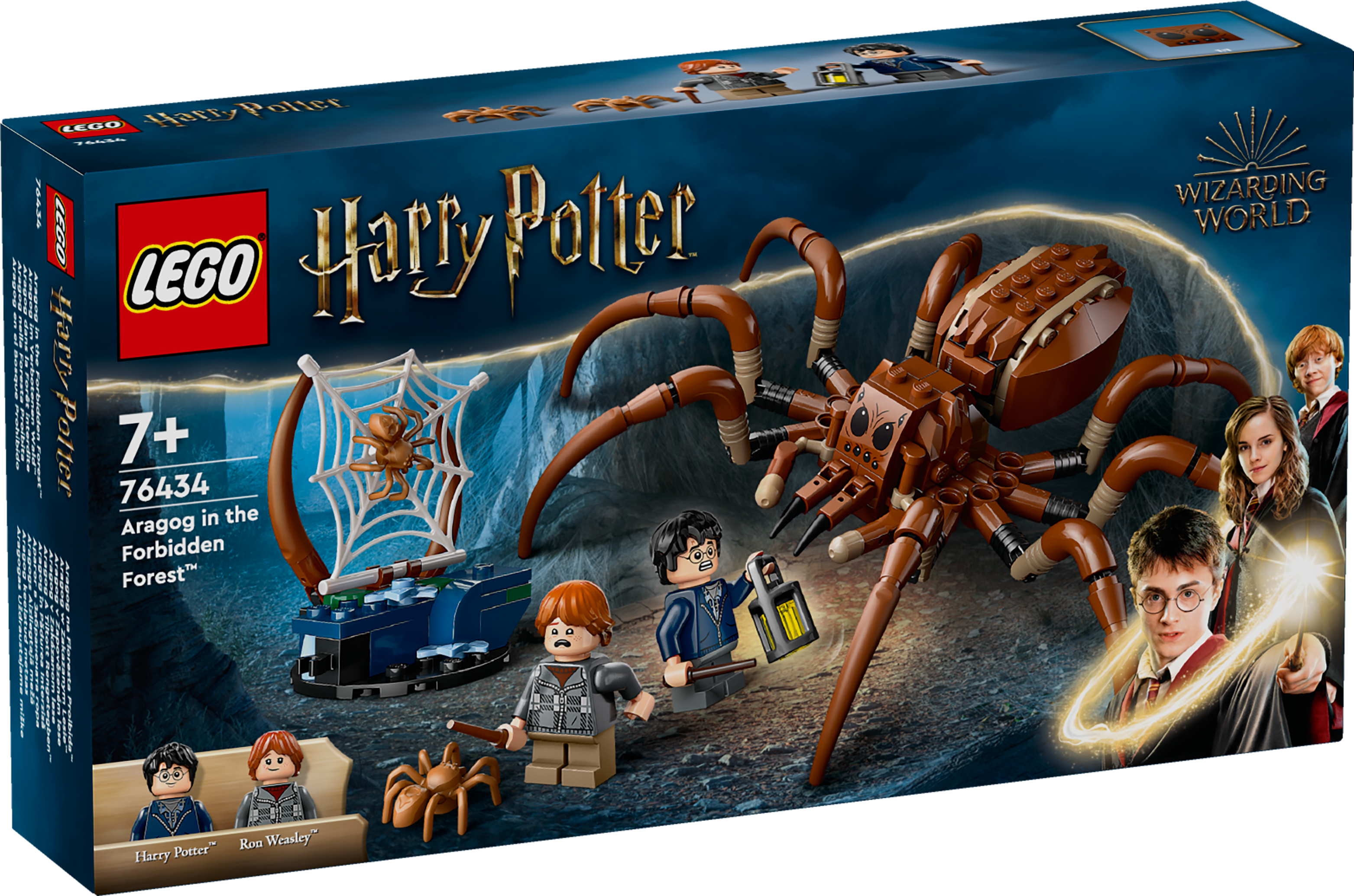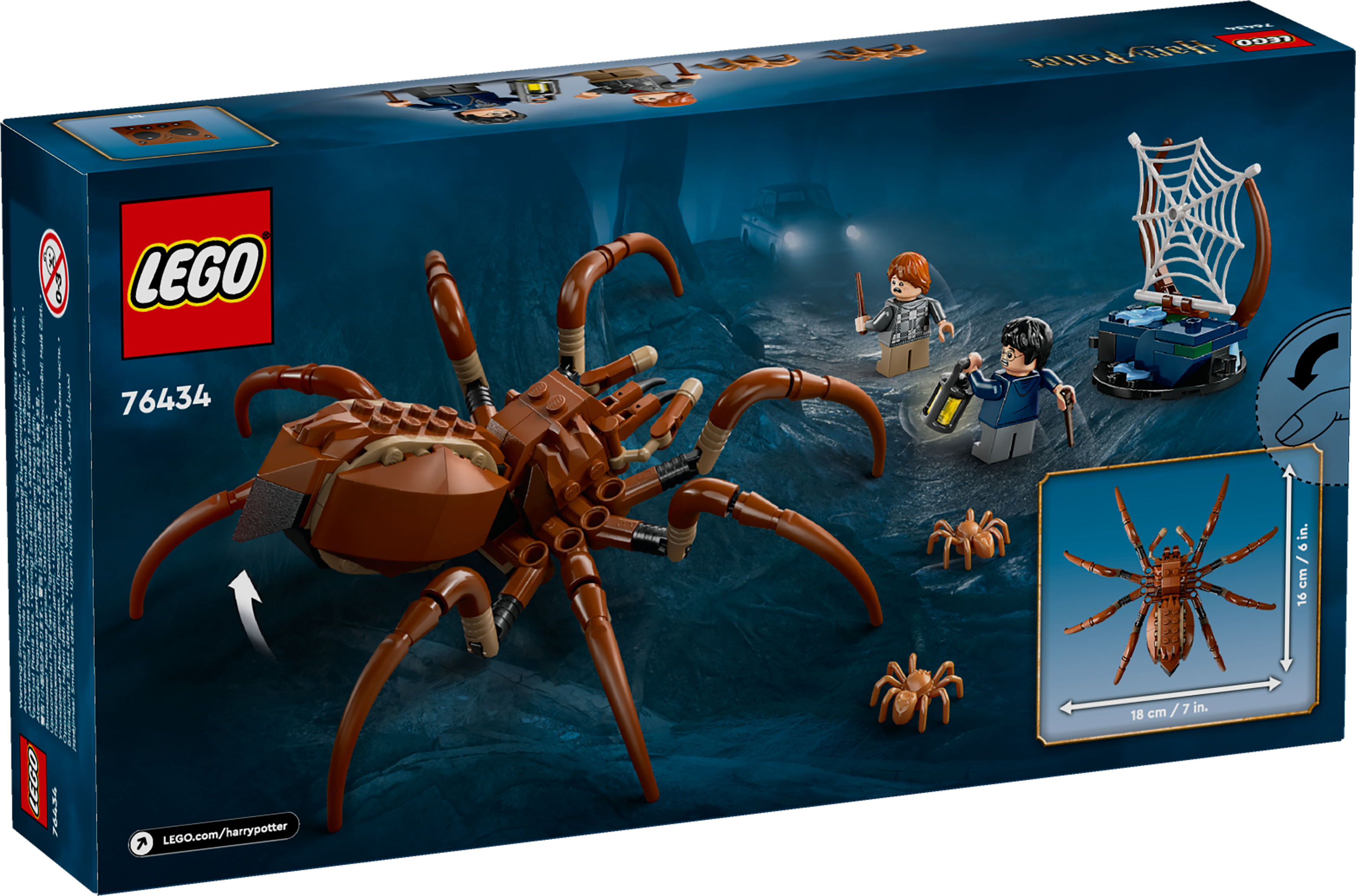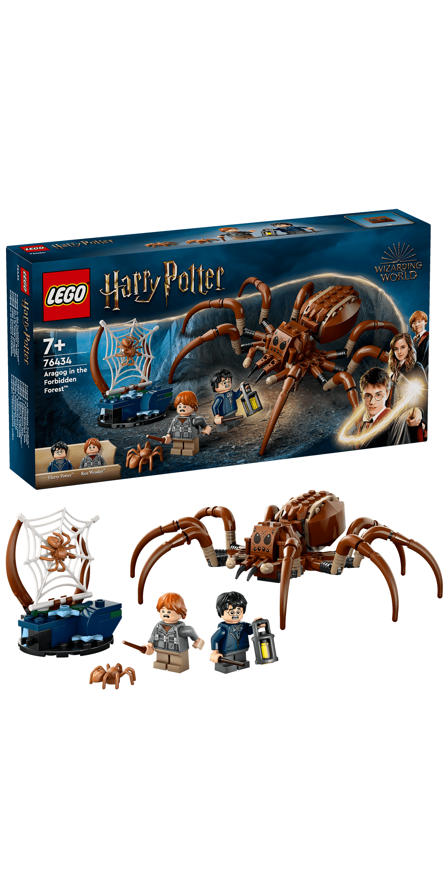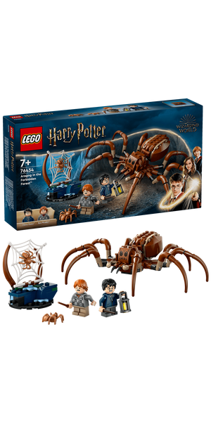 LEGO® Harry Potter™ Aragog im Verbotenen Wald™ (76434) beinhaltet die Figur einer monströsen Spinne, damit junge Zauberer, Hexen oder Muggel magische Abenteuer darstellen können. Das Spielset ist ein zauberhaftes Geschenk für Jungen, Mädchen und alle Harry Potter Fans ab 7 Jahren. Der bisher größte und authentischste Aragog aus LEGO Steinen hat bewegliche Beine, Giftklauen und Pedipalpen. Auch die Minifiguren Harry Potter und Ron Weasley™ (beide wahlweise mit fröhlichem oder ängstlichem Gesicht) mit ihren Zauberstäben und einer Laterne laden zum Spielen ein.