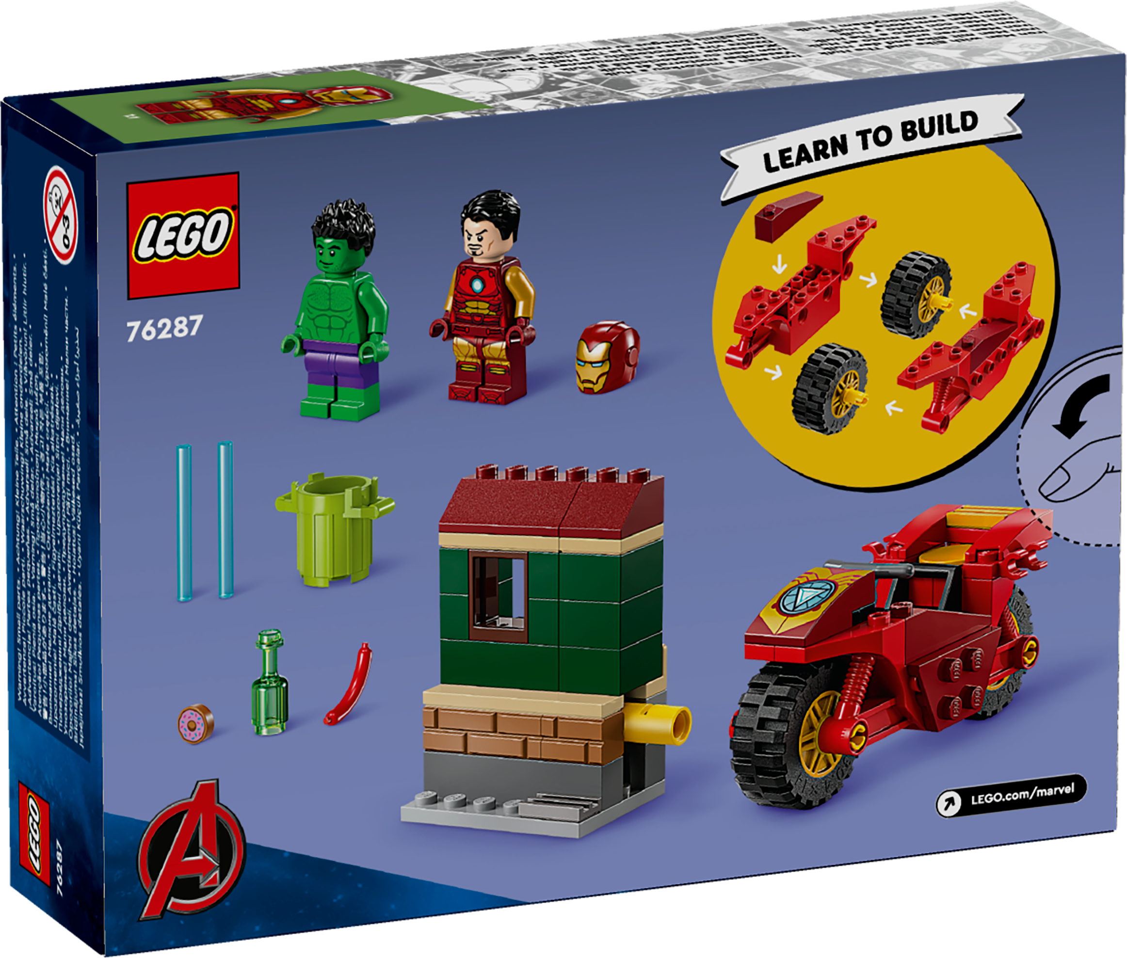 Dieses LEGO Marvel Bauset beinhaltet die Minifiguren Iron Man und den Hulk sowie Iron Mans Schiebemotorrad und ein baubares Haus. Kinder können das Spielzeug-Bike bauen, eine Funktion aktivieren, um das Gebäude einstürzen zu lassen (das passiert häufiger, wenn der Hulk auftaucht), und das Haus neu errichten, damit der Hulk wieder etwas „zu tun“ hat. Ein vorgefertigter Fahrzeugrahmen dient als Starter-Bauelement und erleichtert Kindern das Bauen. Eine intuitive Bauanleitung in Form einer farbenfrohen Bildergeschichte liegt bei. Zusätzlichen digitalen Bauspaß bietet die intuitive LEGO Builder App, in der junge Baumeister Modellansichten vergrößern und drehen können.