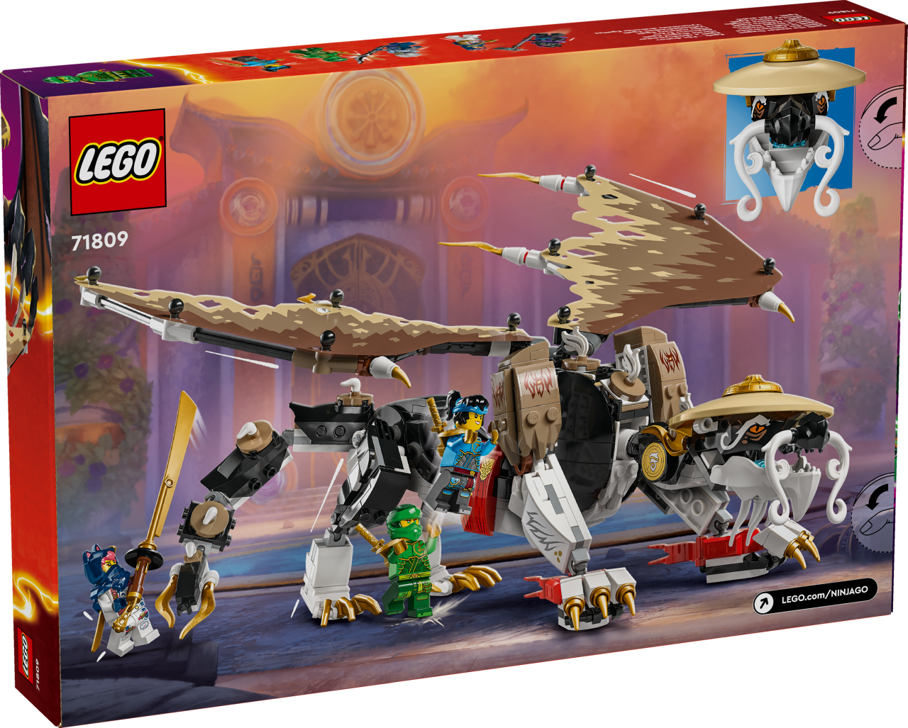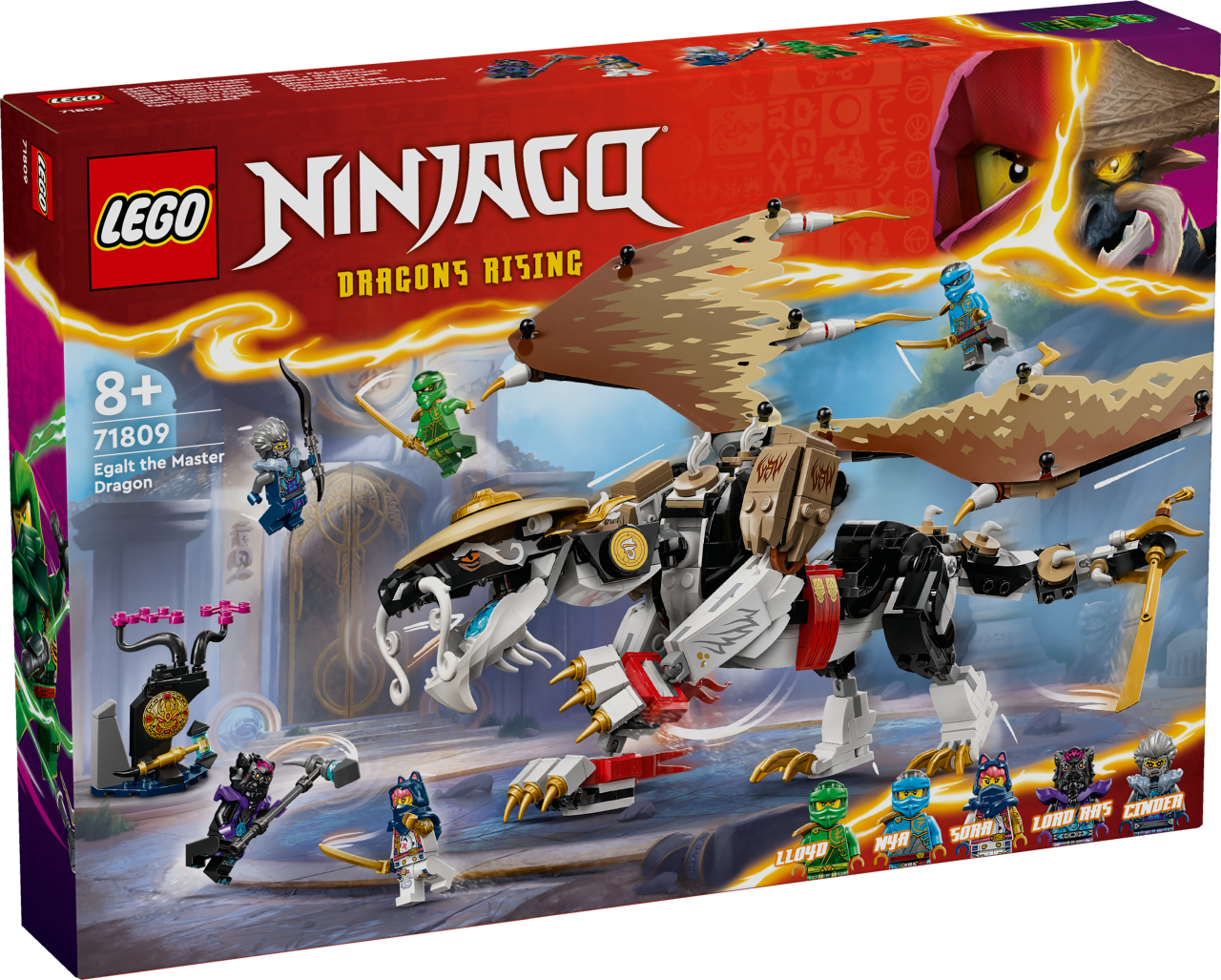 LEGO NINJAGO Egalt der Meisterdrache (71809) ist ein großes Ninja-Spielzeug, mit dem Kinder ab 8 Jahren die spannenden Abenteuer aus der 2. Staffel der TV-Serie NINJAGO Aufstieg der Drachen nachstellen können. Der allererste Drachenmeister in einem NINJAGO Set kann Beine, Flügel, Kopf und Schwanz bewegen, schwingt ein Schwert und trägt eine Scheide für ein Katana auf dem Rücken. Dieses Drachen-Spielzeug beinhaltet 5 LEGO NINJAGO Figuren: Die Ninja-Helden Lloyd, Sora und Nya, die jeweils ein Schwert tragen, sowie die beiden Bösewichte Lord Ras (mit einem Hammer) und Cinder (mit einem Schwert) lassen Kinder spannende Ninja-Abenteuer nachstellen.