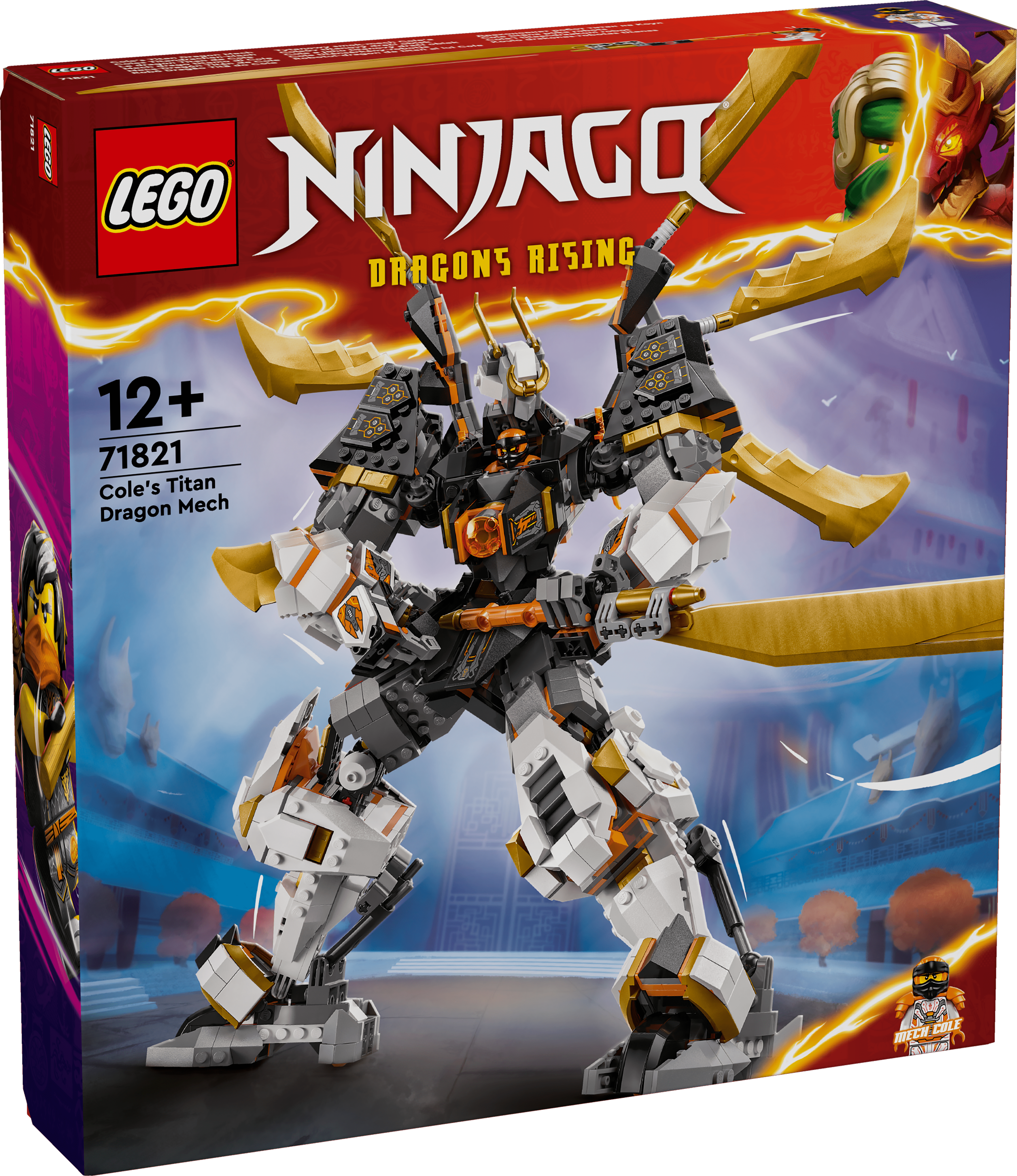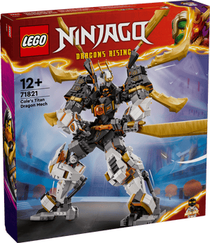 Coles Titandrachen-Mech (71821) ist ein Action-Spielzeug, das Jungen und Mädchen ab 12 Jahren Actionszenen aus der 2. Staffel der TV-Serie NINJAGO Aufstieg der Drachen nachstellen lässt. Dieser bisher größte NINJAGO Mech kann Arme, Beine, Kopf, Rumpf, Flügel und Gelenke bewegen, damit Kinder ihn in coole Actionposen bringen können. Außerdem schwingt er ein großes Schwert.
