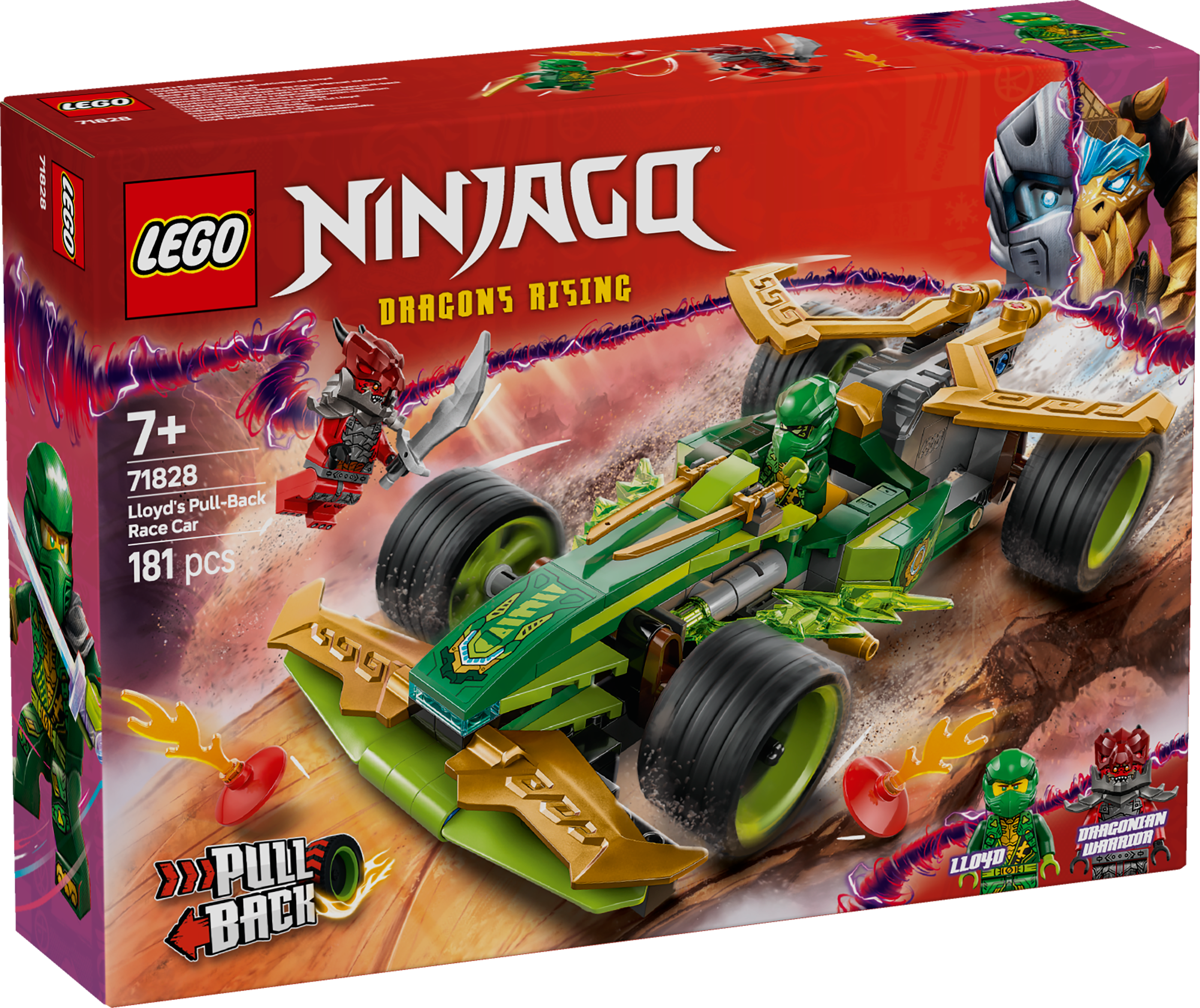 Für spannende Rollenspiele sind in dem Bau- und Spielset 2 NINJAGO Minifiguren enthalten: Lloyd in einer brandneuen Rüstung und mit 2 goldenen Katanas sowie ein böser Drachenkämpfer mit Schwert lassen Kinder packende Duelle austragen. Und mit den beiden Lichtelementen aus dem Bauset kann man eine kleine Hindernisstrecke für den Actionflitzer bauen.