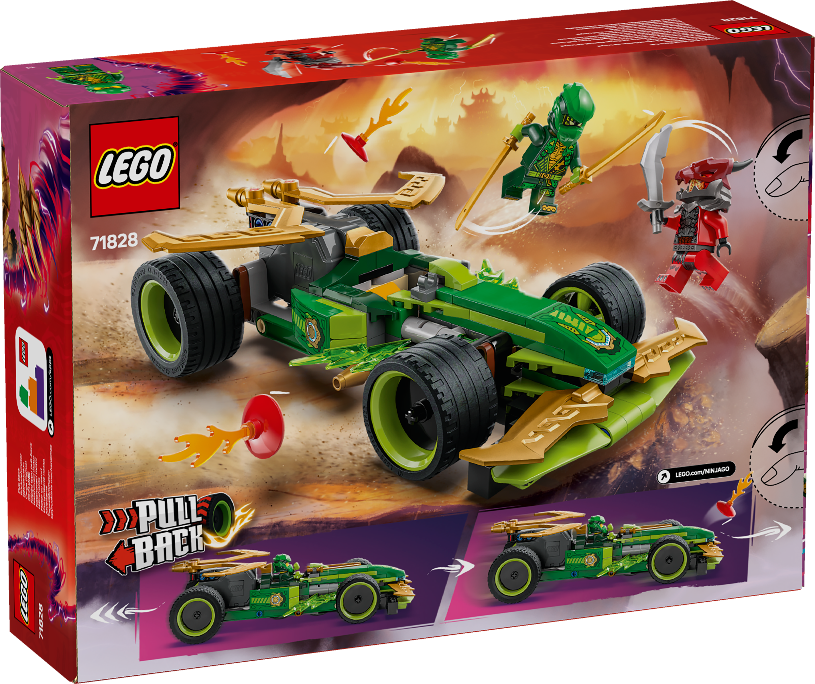 Überrasche deinen kleinen Ninja mit dem allerersten NINJAGO Spielzeug-Rennauto mit Rückziehmotor! Mit dem LEGO NINJAGO Spielset Lloyds Actionflitzer (71828) können Jungen und Mädchen ab 7 Jahren die rasanten Actionszenen aus der 3. Staffel der TV-Serie NINJAGO Aufstieg der Drachen nachstellen. Kinder müssen das Auto Spielzeug nur zurückziehen und können es dann losflitzen lassen. Der windschnittige Rennwagen hat 4 Reifen, ein Cockpit für eine Minifigur und ist mit grünen Blitzklingen verziert.
