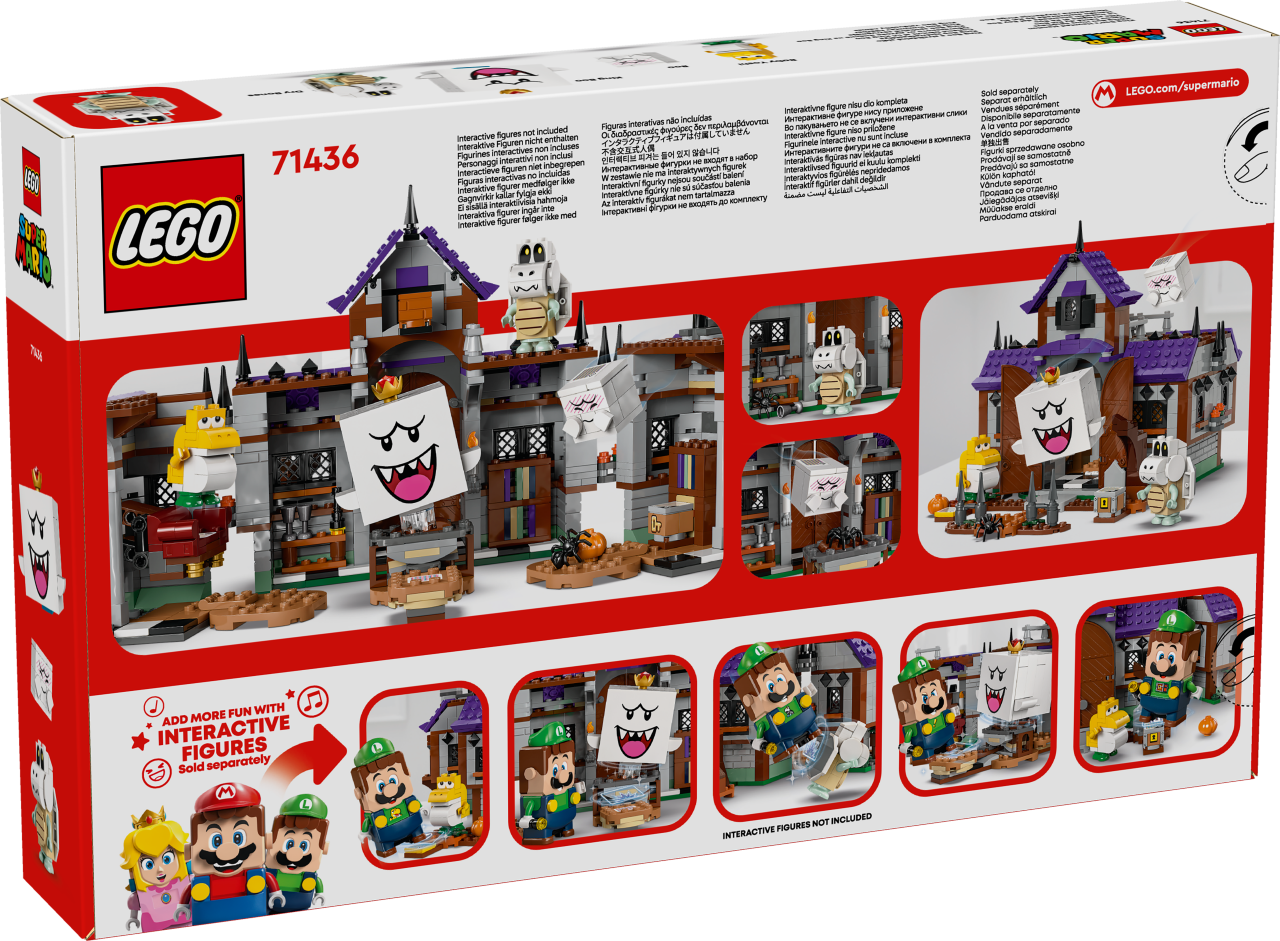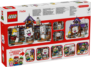 Füge für ein interaktives Spielerlebnis LEGO Mario, LEGO Luigi oder LEGO Peach (Figur nicht enthalten) hinzu. Hilf der Spielzeugfigur, Belohnungen vom Münzblock, Truhenblock und Schlüsselblock zu sammeln, Buu Huu und Knochentrocken zu besiegen, König Buu Huu vom Tisch im Hof zu stürzen und schließlich die Schatztruhe zu öffnen.
