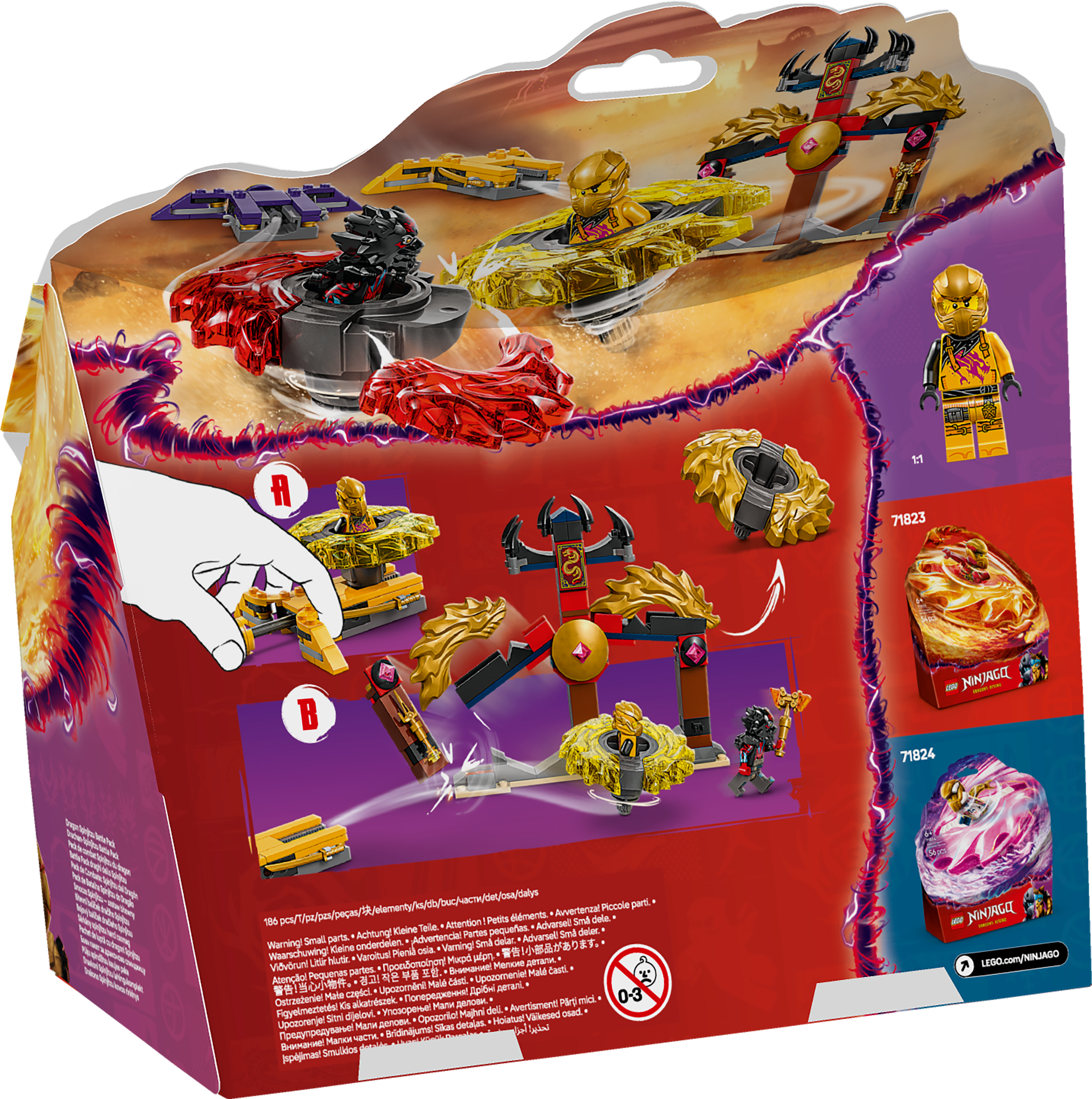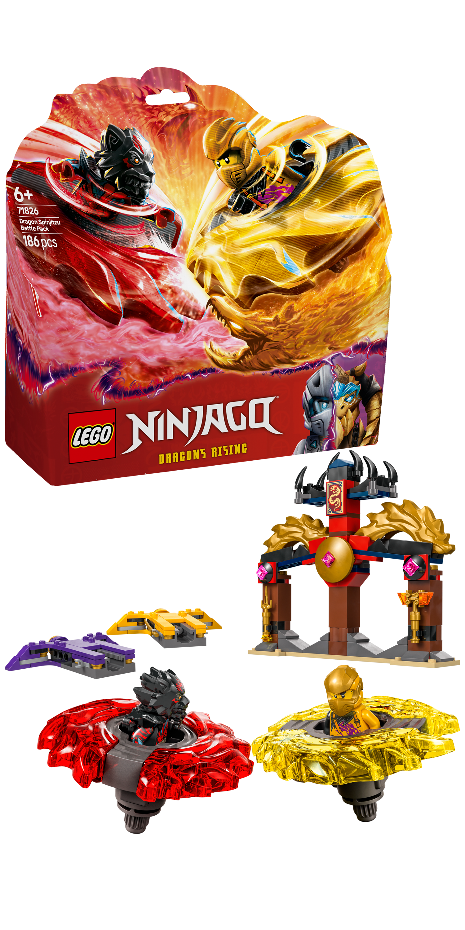 Das Drachen-Spinjitzu Battle Pack (71826) ist ein spannendes Action Spielzeug, das Jungen und Mädchen ab 6 Jahren die atemberaubenden Szenen aus der 3. Staffel der TV-Serie NINJAGO Aufstieg der Drachen nachstellen lässt. Dieses kleine LEGO Spielset beinhaltet eine Tempelarena, die beiden Minifiguren Arin und Ras sowie 2 Drachen-Spinjitzu-Spinner. Kinder können die Spinner in die Startkatapulte stecken und dann loswirbeln lassen, damit sie sich packende Duelle liefern.