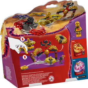 Mit diesem Bauspielzeug können Kinder sich auf spannende Abenteuer, Rollenspiele und Duelle zwischen Gut und Böse freuen. Sie müssen nur Arins gelben Spinner und Ras‘ roten Spinner loswirbeln lassen. An beiden Spielzeugen befinden sich Energie-Elemente, die bei einem Aufprall abplatzen können. Und die NINJAGO Figuren können ihre Spinner mit goldenen Elementen upgraden, wenn sie gegen die Arena prallen und diese zum Einsturz bringen.